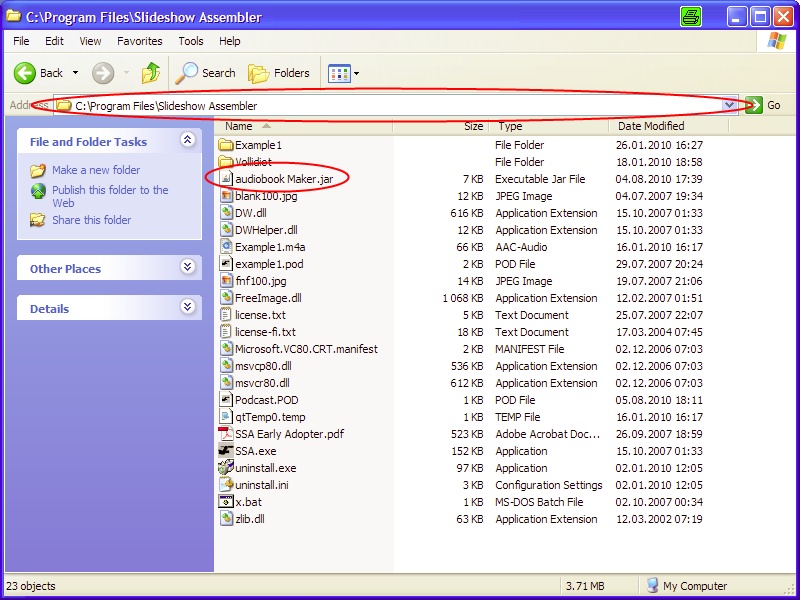 - Verschieben sie nun die audiobook Maker.jar in das Programmverzeichnis von SSA(Bei mir ist das C:\Programme\Slideshow Assambler\)Bild